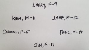 For EPL Group purposes, we use the identifying code created by Leslie Simon and Jan Johnson Drantell in their 1988 book on early death of a parent, The Music I No Longer Heard. I am identified as Jim, F-11 (or Jim, who lost his father when he was 11 years old). During group calls, each person will be encouraged to keep a chart that would look like the one above: just the name and that one bit of information about each person in the group. With these basic, but momentous, facts, we begin the exploration.